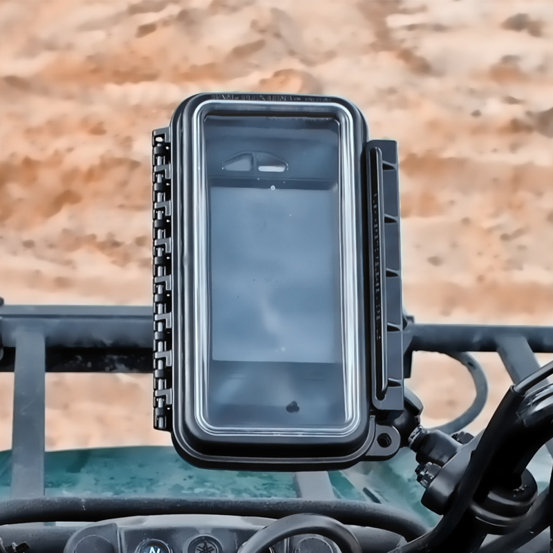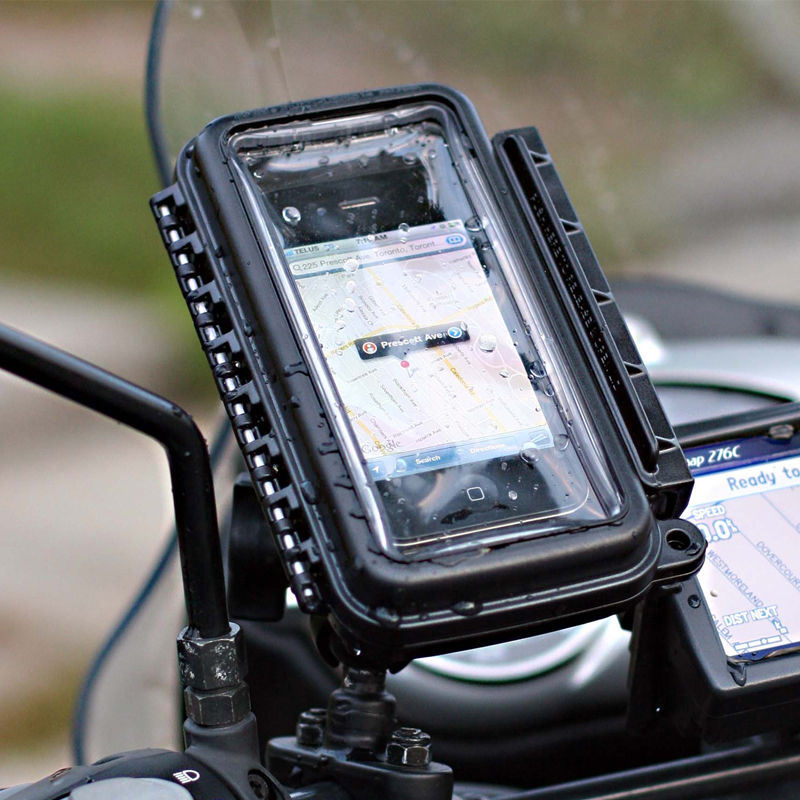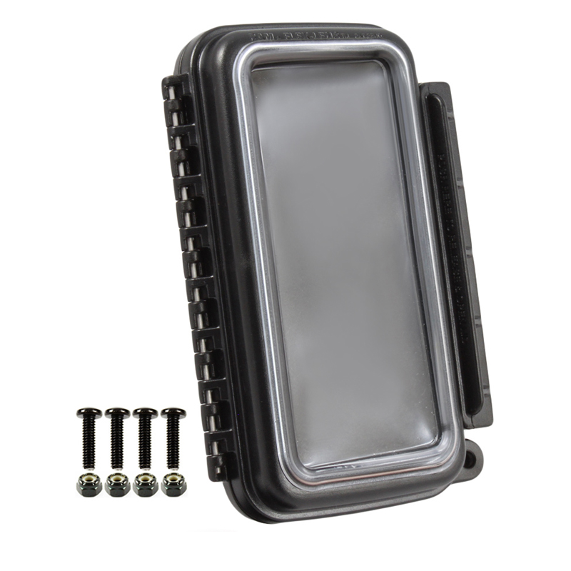 RAM AQUA BOX cases provide sealed enclosure and protection for your handheld devices. The clear, touch through screen allows you to view your electronics as well as use their function keys while in place. There is even a place for a small lock to serve as a theft deterrent. The AMPS hole pattern on the back of the box allows this enclosure to be attached to a multitude of RAM mounting bases and kits. Ideally suited to Motorcycles and ATV’s, keep your portable devices safe, dry, and accessible. Included is a set of four nuts and bolts to connect the cradle to any RAM components or mounts that contain the universal AMPs hole pattern. AQUA BOX Internal Dimensions: Width=2.88″, Height=5.75″, Depth=1.188″ inches AQUA BOX External Dimensions: Width=4″, Height=6.5″, Depth=2″ inches