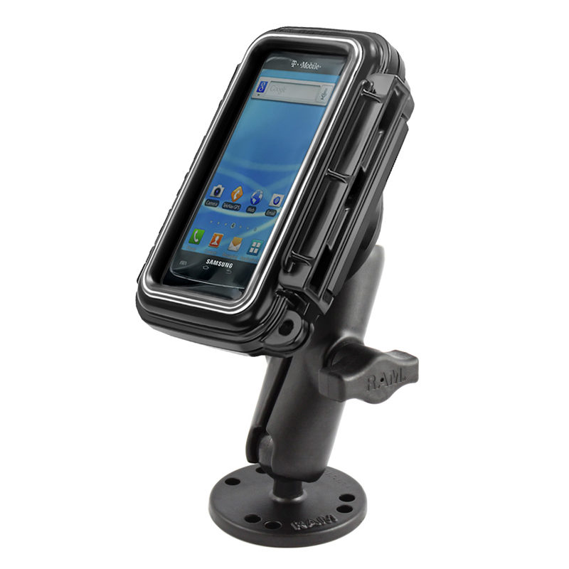 The RAM-B-138-AQ3U consists of a double socket arm, two 2.5″ diameter round bases with the universal AMPS hole pattern and sealed enclosed small size AQUA BOX. The mount is designed with a RAM 1″ diameter patented rubber ball and socket system that has adjustment points at both ends of the double socket arm; this allowing for almost infinite adjustment and perfect viewing angles. The AQUA BOX case provides sealed enclosure and protection for your handheld device. The clear, touch through screen allows you to view your electronics as well as use their function keys while in place. There is even a place for a small lock to serve as a theft deterrent.