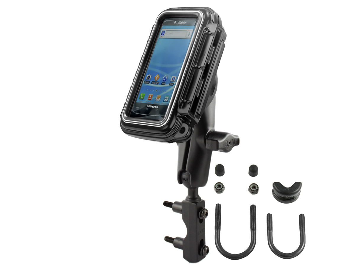 The RAM-B-174-AQ3 consists of a hardware for mounting to both brake/clutch reservoirs and rails that are 0.5″ to 1.25″ in diameter, double socket arm, 2.5″ diameter round bases with the universal AMPS hole pattern and sealed enclosed small size AQUA BOX. The mount is designed with a RAM 1″ diameter patented rubber ball and socket system that has adjustment points at both ends of the double socket arm; this allowing for almost infinite adjustment and perfect viewing angles. The AQUA BOX case provide sealed enclosure and protection for your handheld device. The clear, touch through screen allows you to view your electronics as well as use their function keys while in place. There is even a place for a small lock to serve as a theft deterrent. The mounting hardware for brake/clutch reservoirs include both standard and metric mounting bolts.