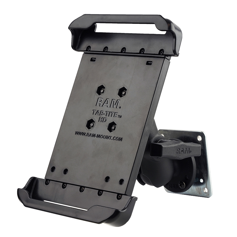 The RAM Tab-Tite bundle is a rugged mount including the RAM Tab-Tite, RAM Universal Double Ball Mount with Two Round Plates, and RAM Backing Plate Adapter. The RAM Tab-Tite spring loaded, quick release holder offers a secure fit with easy access to the mounted tablet. The spring loaded design makes it easy to insert and remove your tablet, along with keeping it secure in mobile applications. The custom end cups are designed to optimize the functionality of your tablet, enabling access to all ports and tablet functions. The RAM-101U-B consists of a short double socket arm and two 2.5″ diameter round bases with the universal AMPS hole pattern. Designed into the mount is a 1.5″ diameter patented rubber ball and socket system with adjustment points at both socket ends of the arm. Rubber ball and socket technology allows for almost infinite adjustment and perfect viewing angles. The included 3″ x 3″ steel backing plate with #10-24 threaded holes attaches to a variety of RAM Mounts ball bases.