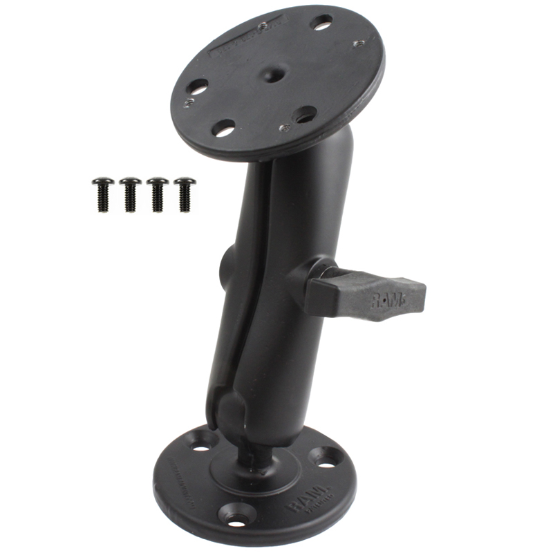 The RAM-101-RM1U consists of a 6 inch double socket arm, and two 3.68″ round bases. The top round base contains pre-drilled holes that connect to Raymarine devices listed below. Designed into the mount is a 1.5″ diameter patented rubber ball and socket system with adjustment points at both socket ends of the arm. Rubber ball and socket technology allows for almost infinite adjustment and perfect viewing angles.