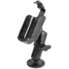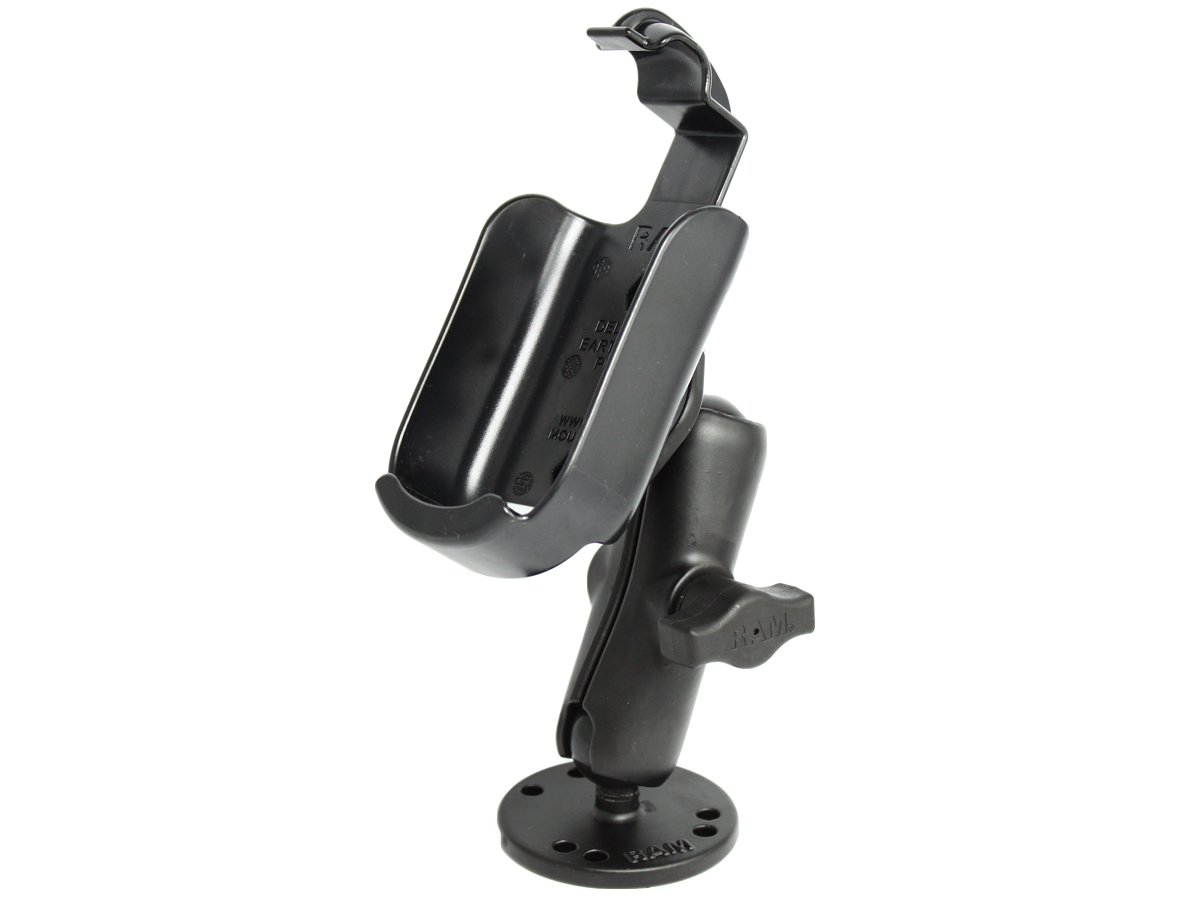 The RAM-B-138-DEL1 consists of a double socket arm, 2.5″ diameter round base with the universal AMPs hole pattern, diamond adapter base and custom high strength composite cradle for the Delorme Earthmate. Designed into the mount is a 1″ diameter patented rubber ball and socket system with adjustment points at the base and cradle. With a twist of the arm knob, you can move the flat surface Delorme Earthmate mount to your optimum viewing position.