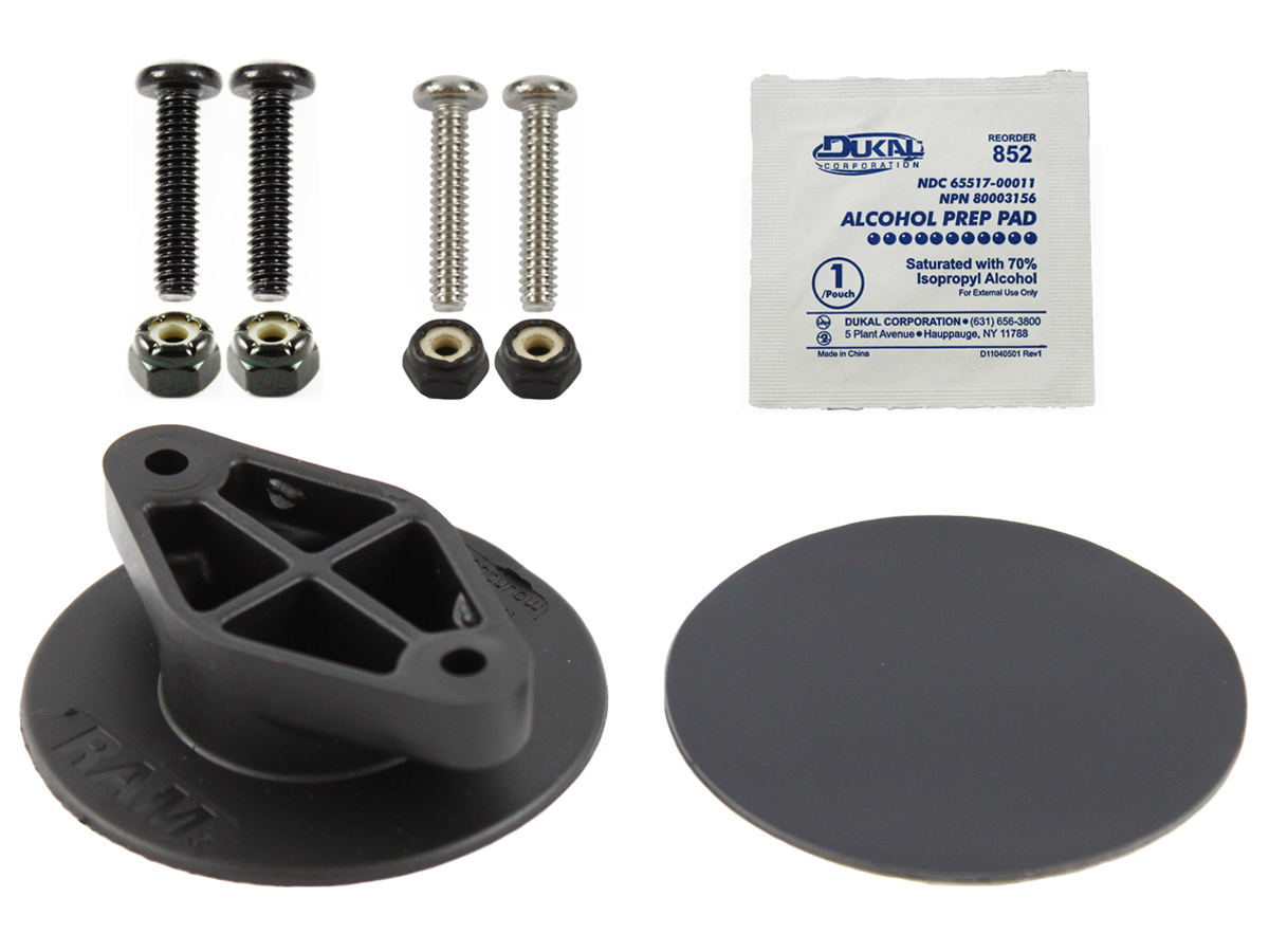 The High Strength Plastic Semi-Permanent Adhesive Mount Base consists of a 2.5″ diameter flexible base with a standard RAM double hole diamond plate end. The base includes a RAM-202PSA Semi-Permanent Adhesive Disk. The diamond plate end has two holes 1.912″ from center to center. This will connect to the RAM-B-238 Diamond Plates Series, to the universal industry standard AMPS hole pattern or directly to the back of the RAM Plastic HOL Cradles. This adhesive base DOES NOT have a RAM 1″ rubber connection ball.