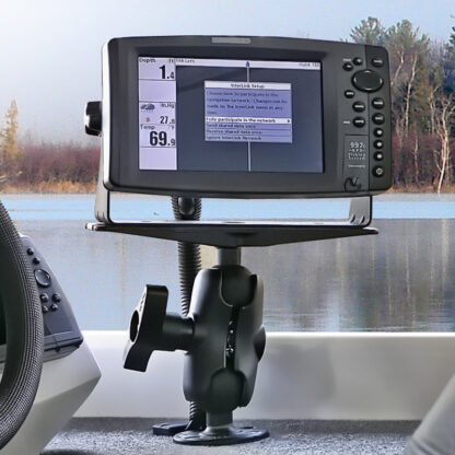 - Complete flat surface, drill-down mounting solution for large marine electronics with an overall height of 8.125″