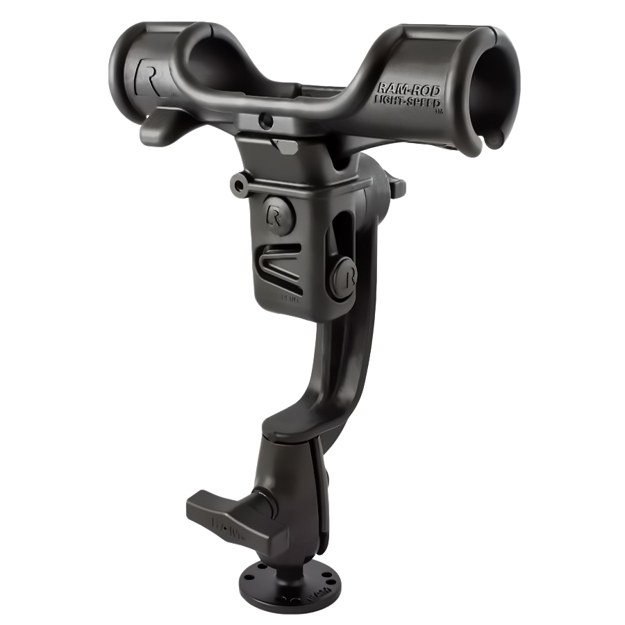 The RAP-370-RBSWU consists of the RAM ROD Light-Speed fishing rod holder, RAM ROD Revolution ratchet arm with single open socket and stainless steel 2.5″ diameter round base that contains the universal AMPS hole pattern. Offering the patented RAM rubber ball, socket and ratcheting feature, you can rotate the rod holder 360 degrees, while tilting the rod holder forward and back for the optimum fishing angle. . The RAM ROD Light-Speed is another innovative product in RAMs long list of high quality, industry leading fishing products. Ideally suited for spinning reels and bait casting reels, the Light-Speed rod holder provides smooth action when inserting and removing the fishing rod, yet holds firm in rough water or while trolling. The spring loaded design enables rapid removal of the rod and reel when a fish is on, and offers easy placement of the rod in the rod holder.