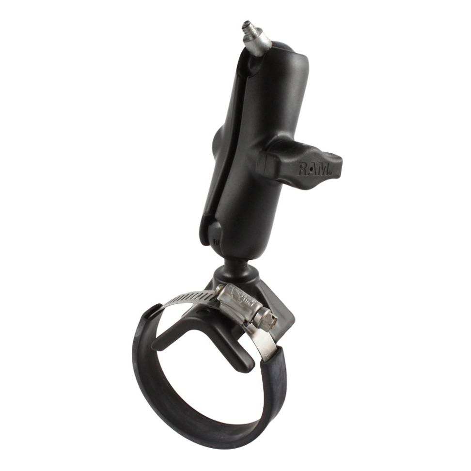 The RAM-B-101U-UE1 consists of a medium length B-size arm with a 1/4″-20 threaded stud and a strap clamp base for rails between .875″ and 2.75″ in diameter.
