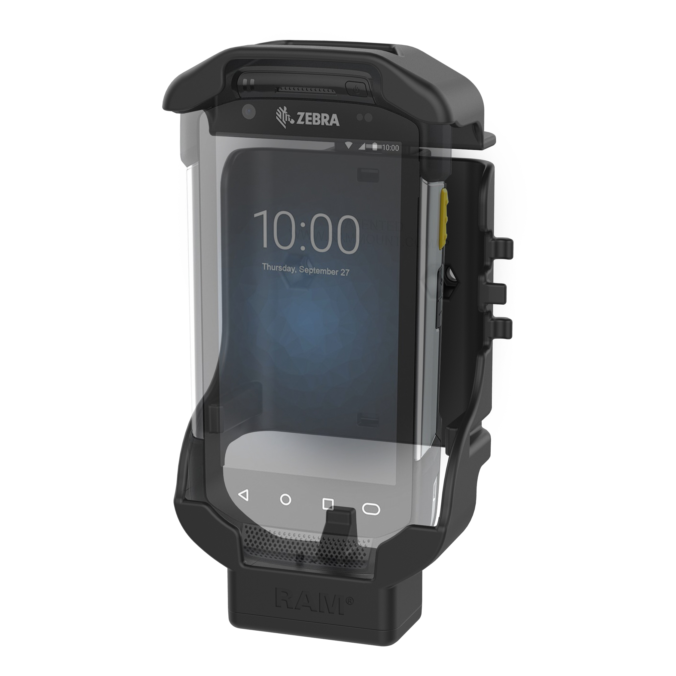 This spring-loaded form-fit holder allows you to secure your Zebra TC70, TC72, TC75, or TC77 with or without the Zebra Handstrap accessory. An integrated stylus holder snaps your stylus into place while not in use with a loophole to tether to the cradle. The cradle is compatible with RAM two-hole AMPS pattern diamond bases that will connect to B and C size ball mounts, allowing for a wide variety of mounting options (hardware included).