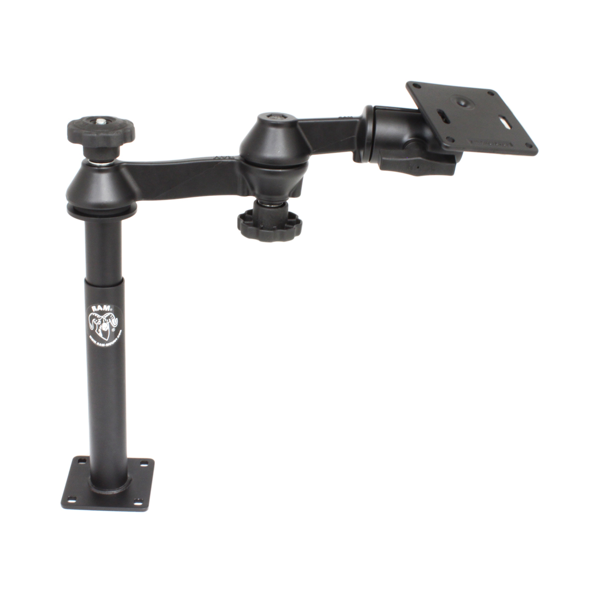 The RAM-VP-SW1-89-2461 consists of a 9″ lower female Tele-Pole, 8″ upper male Tele-Pole, double swing arm and 3.625″ square base that contains the VESA hole pattern. The lower female Tele-Pole will attach to all RAM vehicles bases that do not contain a welded female Tele-Pole. The height of the Tele-Poles, combined, can easily be adjusted by turning the knob at the top of the post. Once the knob has been tightened, the Tele-Pole becomes a rigid support for connecting devices or cradles. The double swing arm allows you to twist and tilt the viewing angle of your connected electronic device, when mounted on your RAM Vehicle Mount. The rotating swivel arm gives you even more viewing positions for your mounted electronic device while holding everything firmly in place. The length of the double swing arm is 12″. The 3.625″ square base includes a 75mm X 75mm VESA hole pattern with 1.5″ rubber ball positioned 0.88″ from the center of one edge.