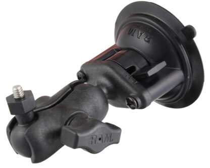 The RAP-B-224-A-379-252025 consists of a 3.3″ suction cup twist lock base, SHORT double socket arm and 1″ ball, connected to the RAM Tough-Ball with 1/4″-20 camera thread. The suction cup base is designed to have a strong hold on glass and non-porous plastic surfaces, including RAM adhesive disks. The male 1/4″-20 threaded steel stud will connect to any standard female thread found on camcorders, digital cameras and POV cameras. The mount is designed with a RAM 1″ diameter patented rubber ball and socket system that has adjustment points at both ends of the double socket arm; this allowing for almost infinite adjustment and perfect viewing angles.