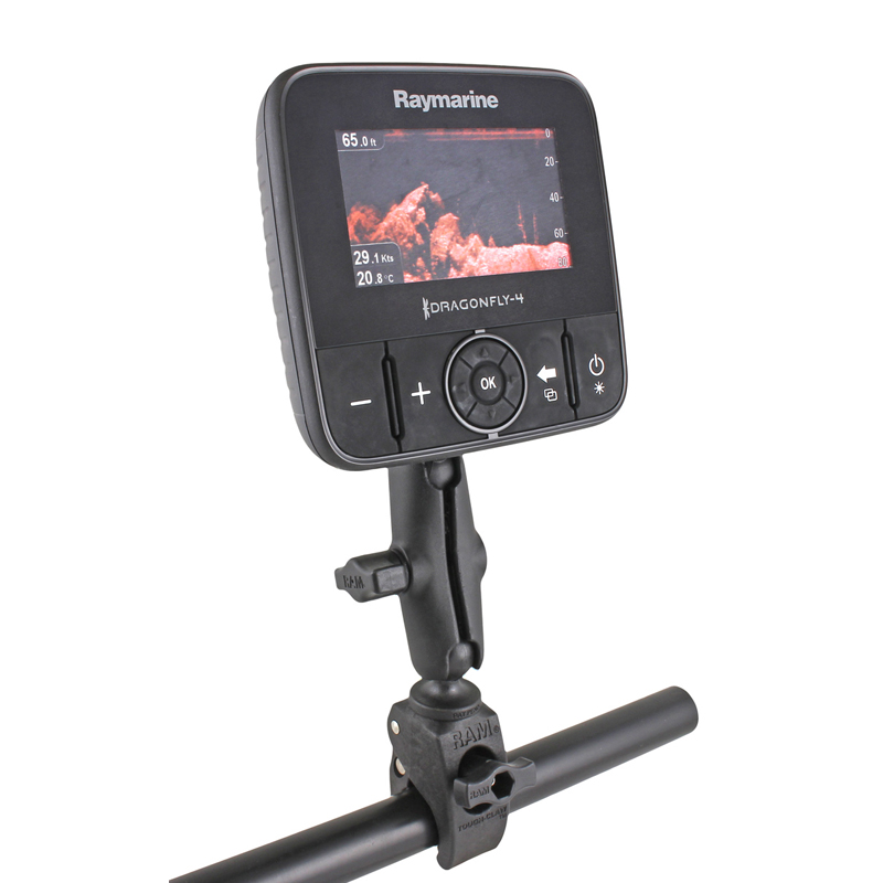 The RAM-B-400-379-M616 consists of the Tough-Claw rail clamp base, STANDARD length double socket arm and 1″ diameter ball, containing a M6 x 30 SS HEX head bolt. The Tough-Claw rail clamp base is the perfect mounting base for quick and easy tool-less installation and removal on round, square, odd shaped rails and bars. The mount is designed with a RAM 1″ diameter patented rubber ball and socket system that has adjustment points at both ends of the double socket arm; this allowing for almost infinite adjustment and perfect viewing angles. The RAM-B-400-379-M616 reduces the mounting footprint, compared to old dragonfly units that contain a large neck. This mount allows for a seamless marriage of RAM components into your Raymarine system, opening up the ball and socket system and all of our mounting options to you.