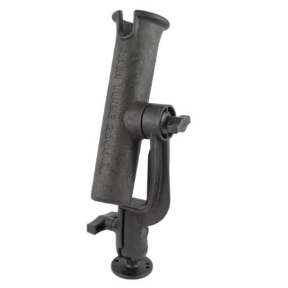 The RAM-301-RBSW consists of the RAM-TUBE 2008 fishing rod holder, RAM ROD Revolution ratchet arm with single open socket and 2.5″ diameter round base that contains the universal AMPS hole pattern. Offering the patented RAM rubber ball, socket and ratcheting feature, you can rotate the rod holder 360 degrees, while tilting the cradle forward and back for the optimum angle. The RAM-TUBE 2008 tube holder integrates the patented rubber ball and socket design with a self draining and quick to access tube for the butt of most any fishing rod. The tube is made of extremely durable composite. Ideally suited for anything from Kayaks to Tournament boats, this compact and simply design is ready for your next day on the water.