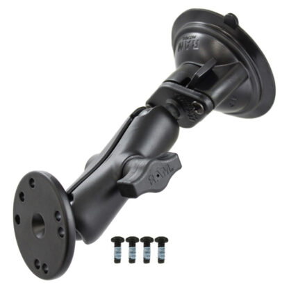 The RAM-B-166-202U-UK1 consists of a 3.3″ suction cup twist lock base, standard length double socket arm, round base adapter that contains the universal AMPs hole pattern and mounting hardware. The mount is designed with a RAM 1″ diameter patented rubber ball and socket system that has adjustment points at both ends of the double socket arm; this allowing for almost infinite adjustment and perfect viewing angles. The hole pattern found on the round base adapter will connect to many RAM cradles. The suction cup base is designed to have a strong hold on glass and non-porous plastic surfaces, including RAM adhesive disks.