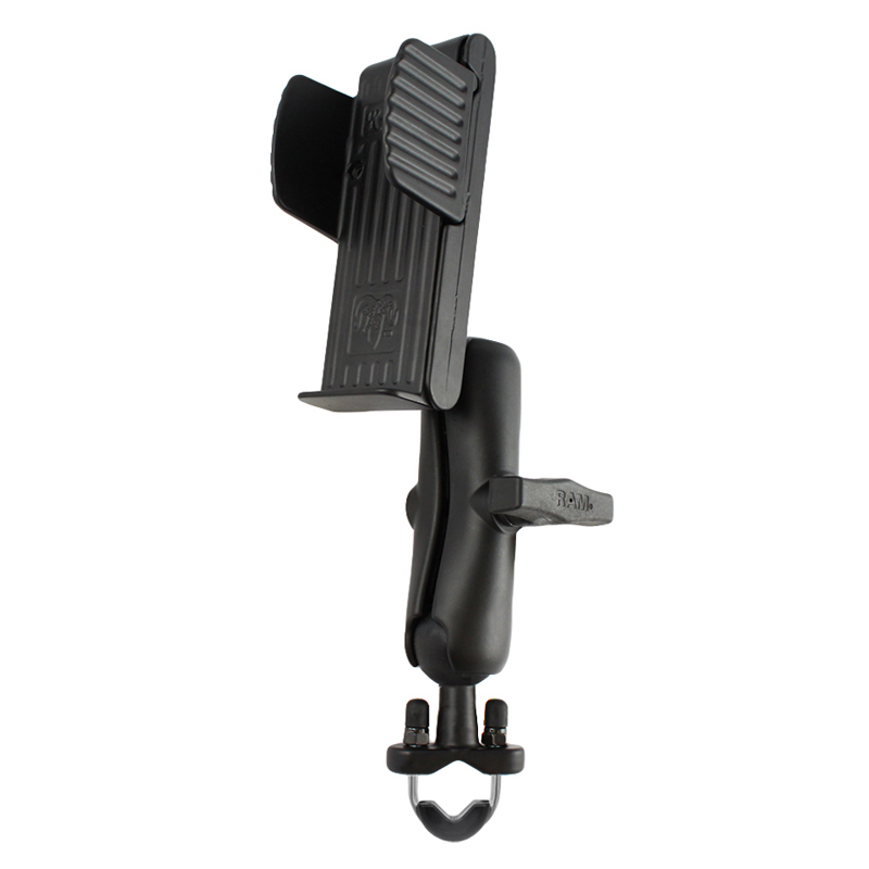 The RAM-120-231 consists of a ”rust-proof” stainless steel u-bolt base, double socket arm and universal side clamping holder. Included in this package is hardware that will accommodate rails from 0.5″ to 1″ in diameter. The base includes black cover caps to be placed over the exposed ends of the u-bolt. The included composite rail adapter can narrow the rail to a minimum width of 0.5″. The mount is designed with a RAM 1.5″ diameter patented rubber ball and socket system that has adjustment points at both ends of the double socket arm; this allowing for almost infinite adjustment and perfect viewing angles. The side clamping holder can expand and contract, securing your device for a custom fit.