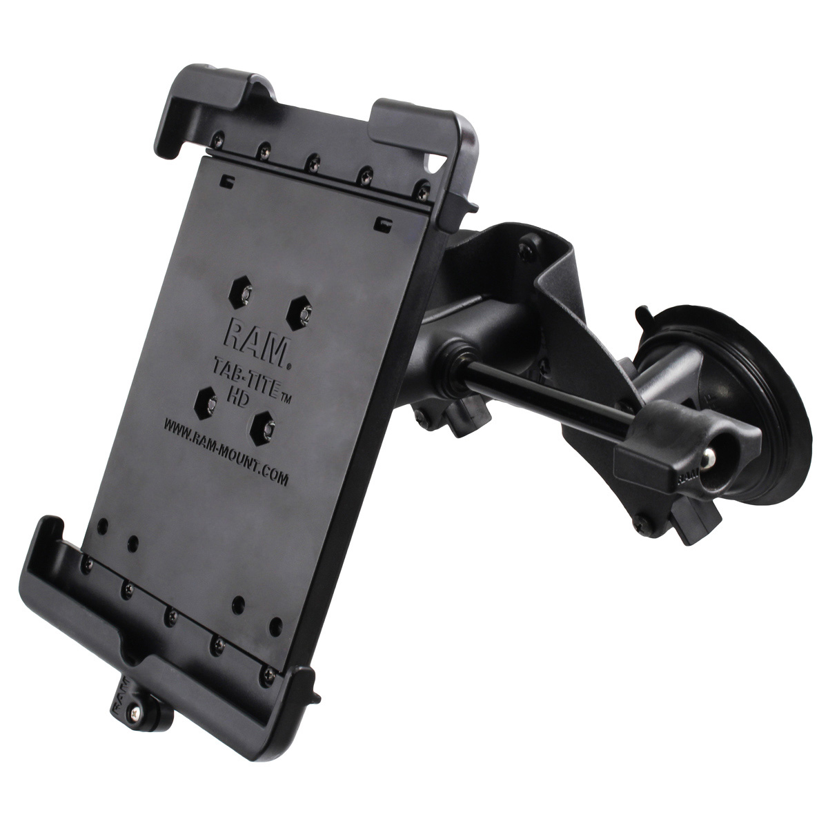 The RAM-B-189-TAB11-ALA1-KRU consists of a double 3.3″ twist lock suction cup base, double socket arm, diamond base adapter, extended retention knob and Tab-Tite universal clamping cradle. The included backplate is interchangeable with various size support cups, making it compatible with numerous tablet models. New detachable support cups are the only components needed for purchase, attach to the backplate for support of your new tablet.The Tab-Tite cradle is compatible with any tablet that will fit the dimensions listed below. It is important to verify the dimensions of your tablet when determining the overall size.