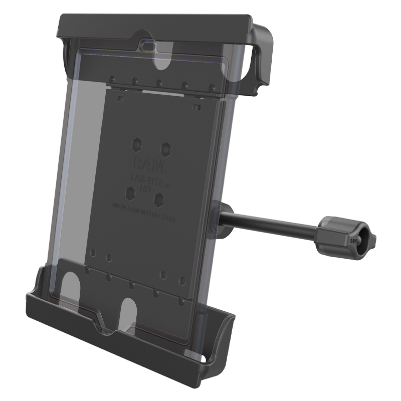 Get the most out of your tablet with the RAM Tab-Tite spring loaded, quick release cradle. With interchangeable cup ends, you can fit the cradle to your tablet for a near custom fit. This spring loaded design makes it easy to load and unload your tablet, along with keeping it secure while on the go. Cup ends are designed to optimize the functionality of your tablet, allowing access to audio jacks, usb, power, and other ports, your tablet can be used just as it was intended. Perfect for stationary or on the go applications, this new RAM product is just what you need to get the most out of your tablet. Connected to the RAM Tab-Tite is a round plate with 1″ ball, connected to a short length double socket arm with retension knob. The open socket on the opposite end of the socket arm can clamp onto any RAM 1″ ball components to complete your solutions, with infinite adjustability and the freedom to mount your tablet virtually anywhere. The Tab-Tite cradle is compatible with any tablet that will fit the dimensions listed below. It is important to verify the dimensions of your tablet when determining the overall size.